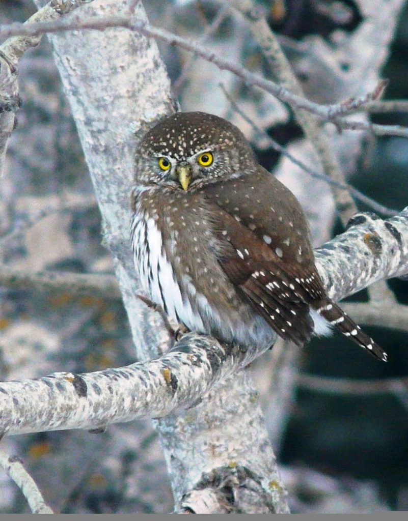 (Tecolotito serrano).Glaucidium gnoma. Pequeño búho de color café grisáceo; cabeza, nuca y dorso con manchas o motas chicas blancas o beige; el cuello, con un collar blanco y negro, pasando a ser completamente negro hacia los lados. Se localiza en las zonas altas de las montañas, bosque mesófilo y de pino–encino. Se reporta en los …