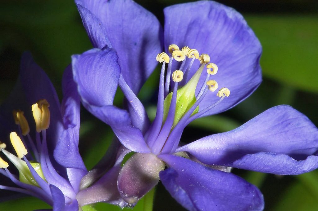 Jacaranda mimosaefolia D. Don. Árbol de la familia de las bignoniáceas, de ocho m de altura en promedio, de tallo recto, ramas horizontales y ascendentes, hojas bipinnadas y hojuelas imparipinnadas. Las flores, moradas o lila azuladas, son hermafroditas, asimétricas y se dan dispuestas en racimos. Cada una presenta cáliz campanulado y lobado; corola de cinco …