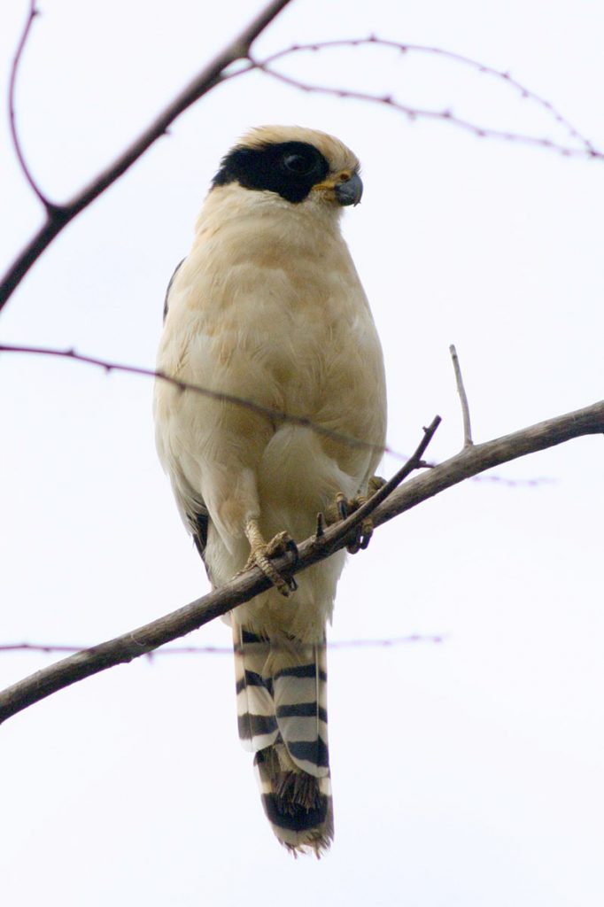Herpetotheres cachinnans. Familia de los Falcónidos; de cabeza grande, color ante o crema pálido y café oscuro; posee una franja negra en la cara, semejando una máscara; la corona, la base del cuello y las partes inferiores son de color ante; áreas superiores de café intenso; la cola, con bandas color ante y negro; al …
